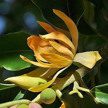 In the wild, Michelia grows to 15', a Christmas tree shape with shiny green leaves. The aromatic gold blossoms are present almost year-round. On a warm night, you can enjoy the citrus/honeysuckle fragrance a hundred feet away. This plant really is a joy.